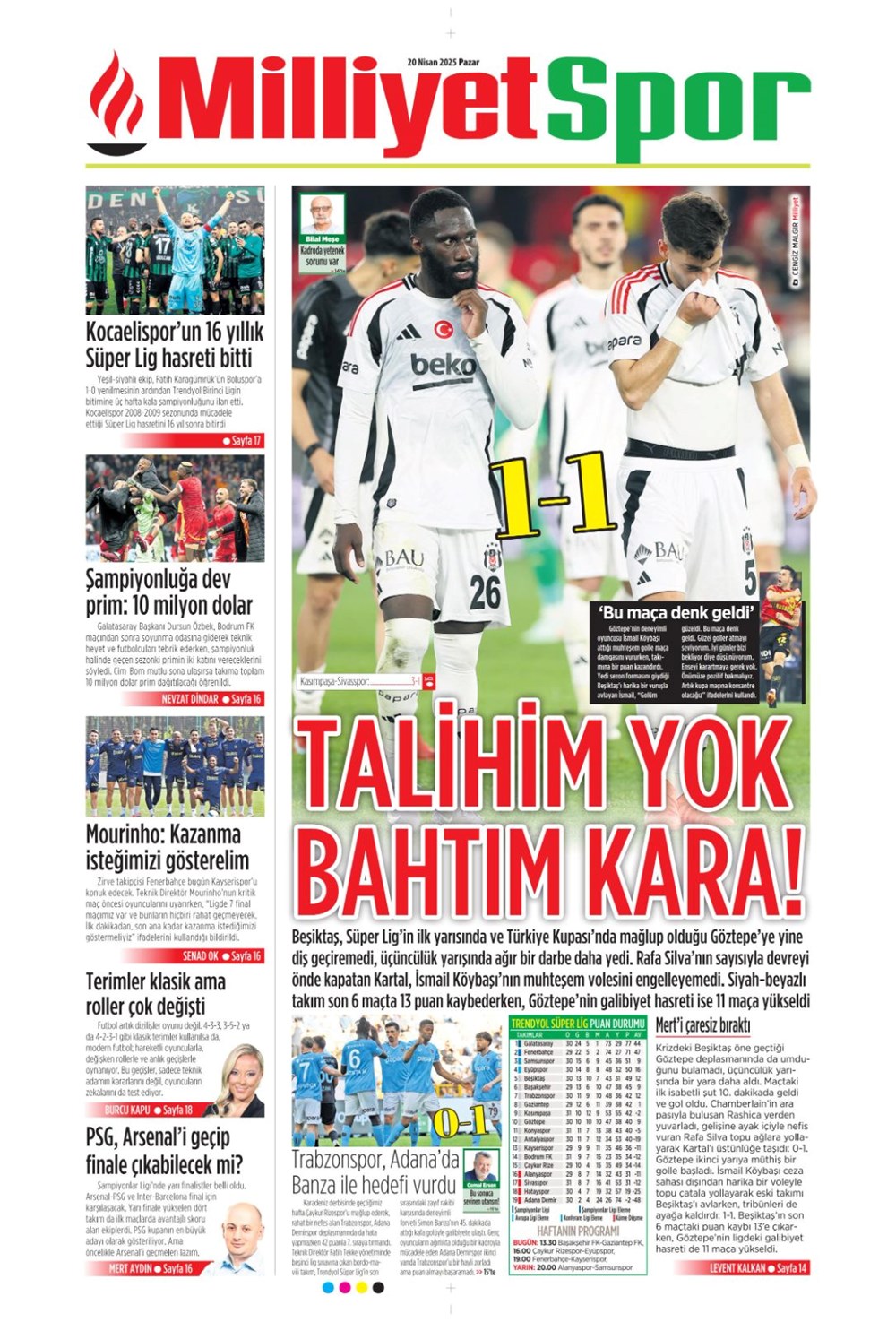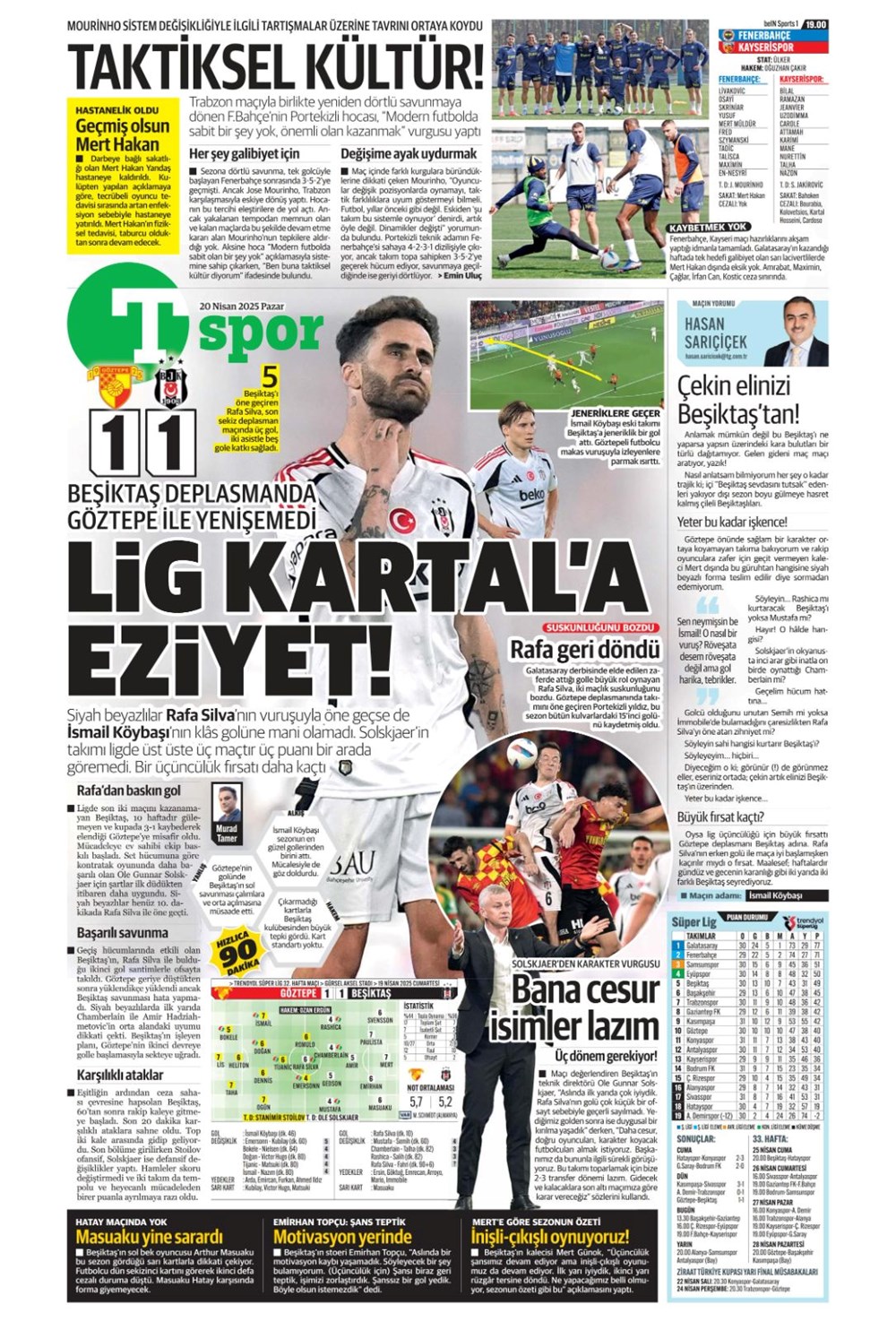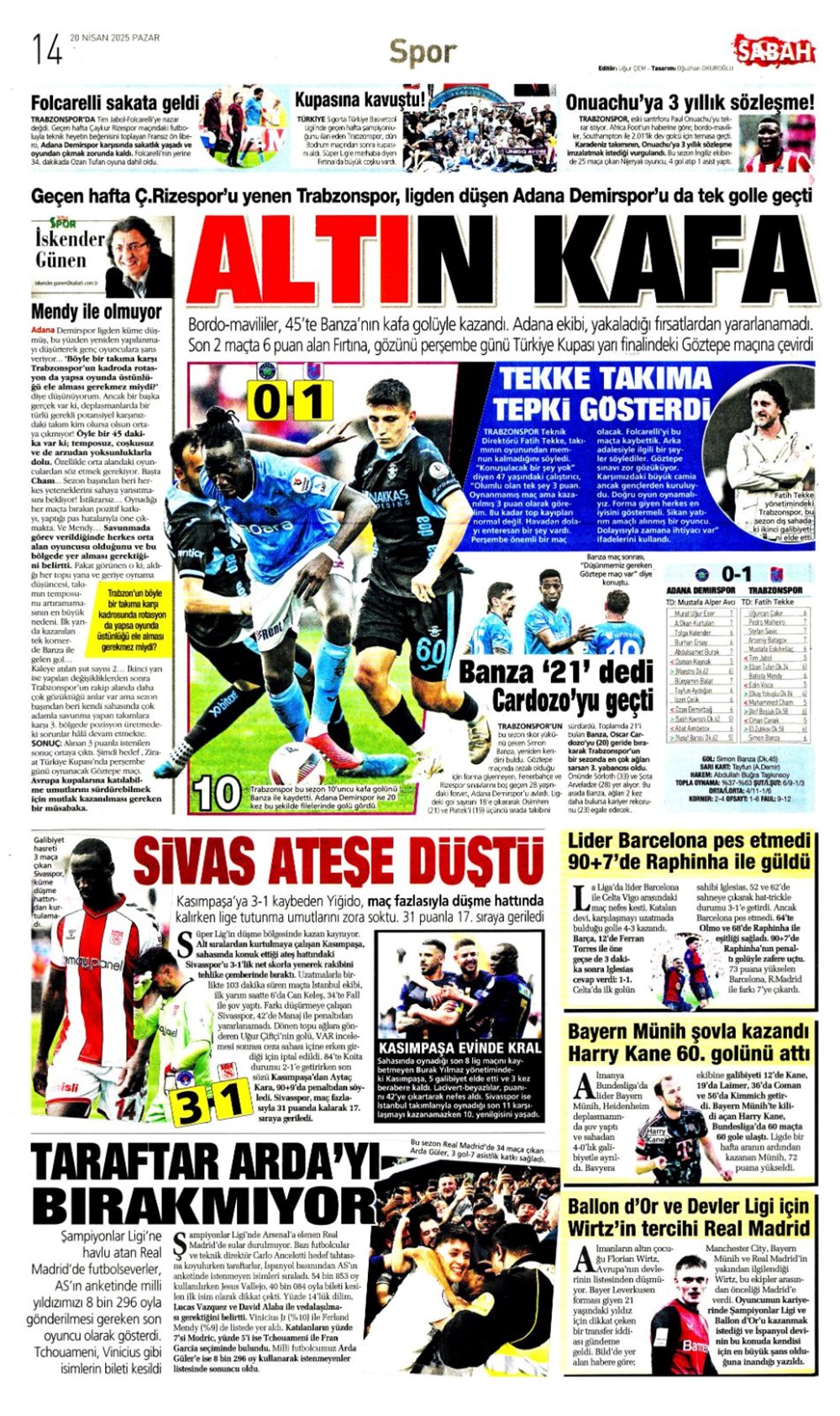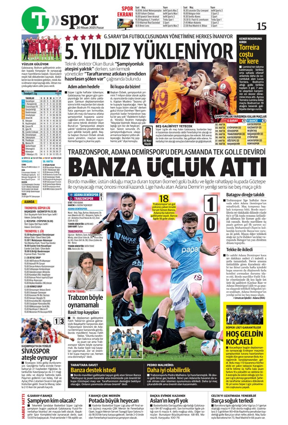 “Kartal’a İzmir’de soğuk duş” (20 Nisan 2025 spor manşetleri)Günün spor manşetlerinde, spor gündemiyle alakalı en yeni gelişmeler ve transfer haberleri belli oldu. 20 Nisan 2025 tarihli gazetelerin spor sayfalarına, Beşiktaş, Fenerbahçe, Galatasaray ve Trabzonspor’un haberlerine, 1 dakikada göz atın.