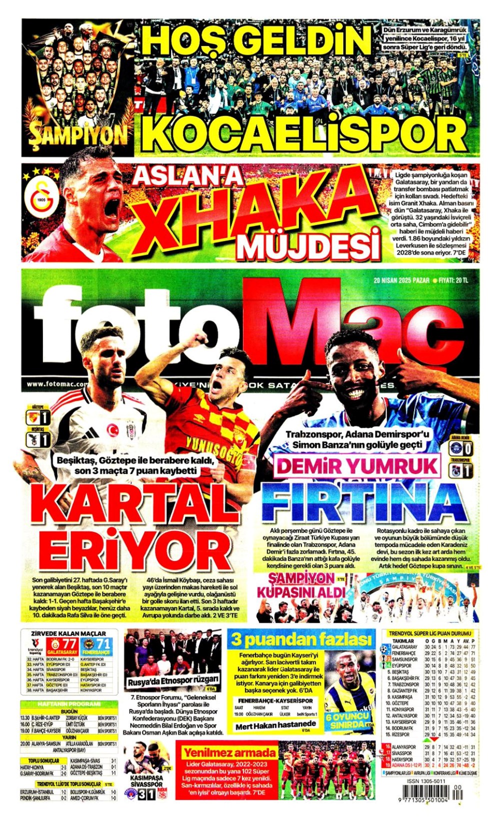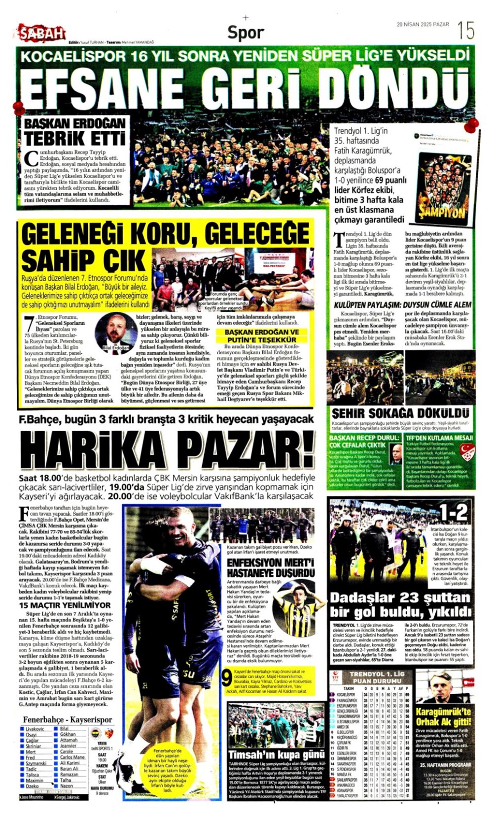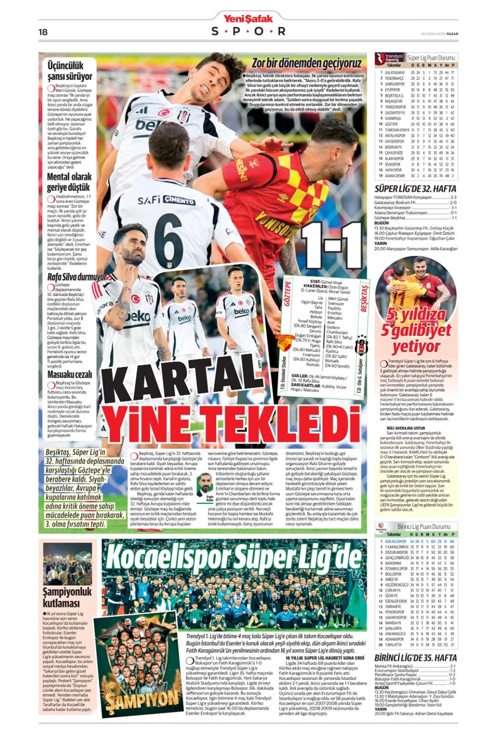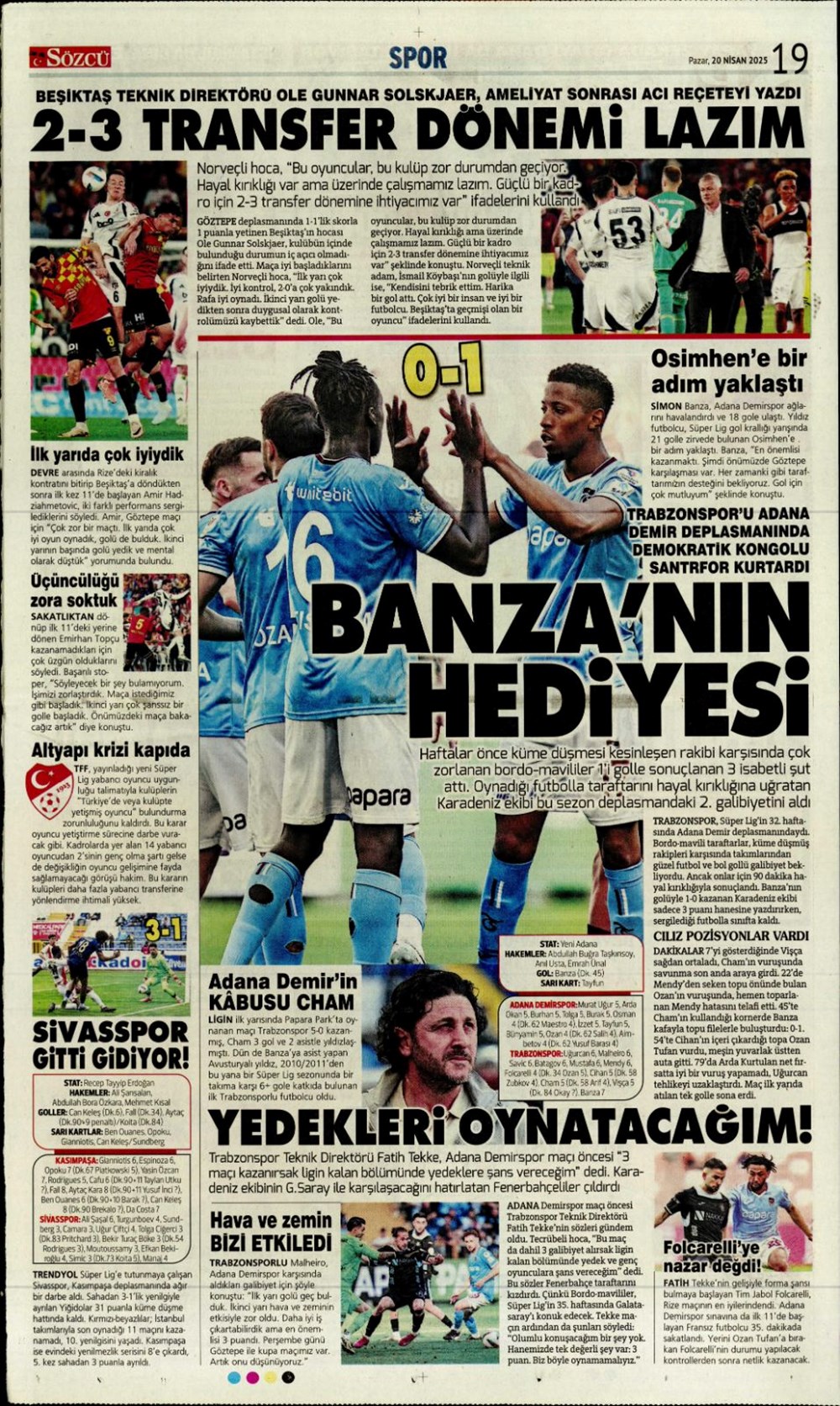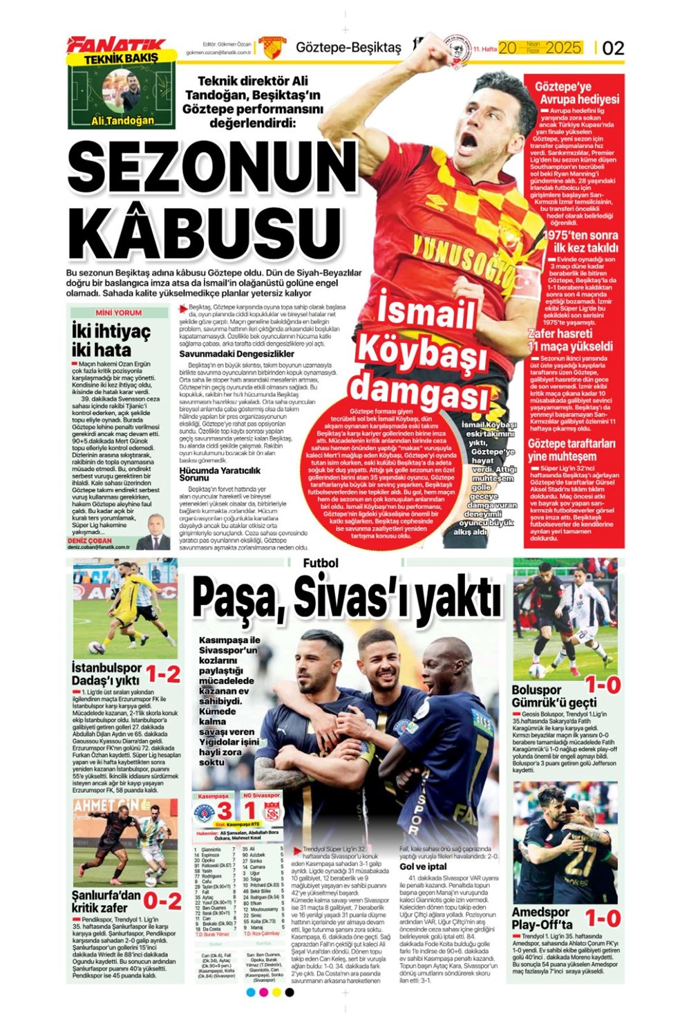 “Kartal’a İzmir’de soğuk duş” (20 Nisan 2025 spor manşetleri)Günün spor manşetlerinde, spor gündemiyle alakalı en yeni gelişmeler ve transfer haberleri belli oldu. 20 Nisan 2025 tarihli gazetelerin spor sayfalarına, Beşiktaş, Fenerbahçe, Galatasaray ve Trabzonspor’un haberlerine, 1 dakikada göz atın.