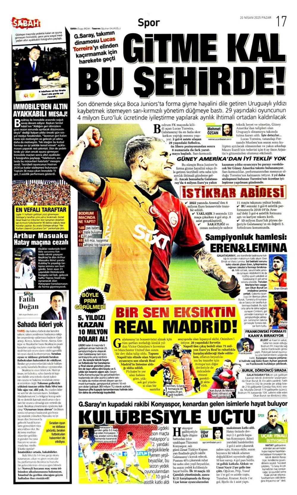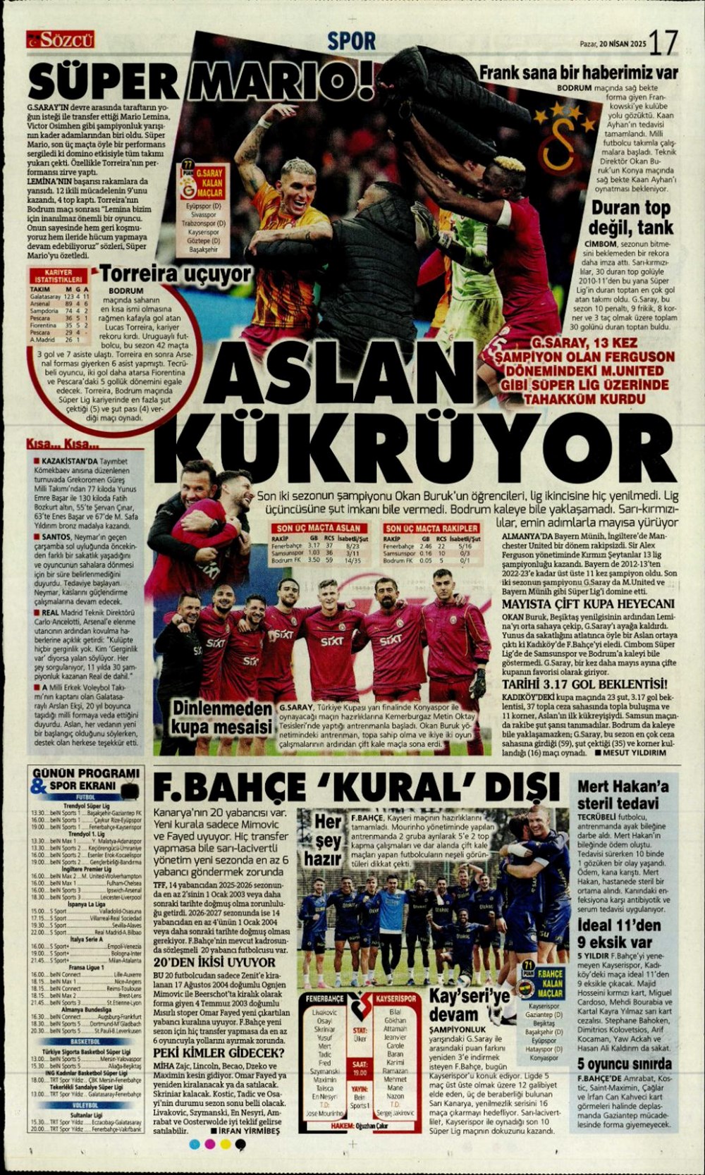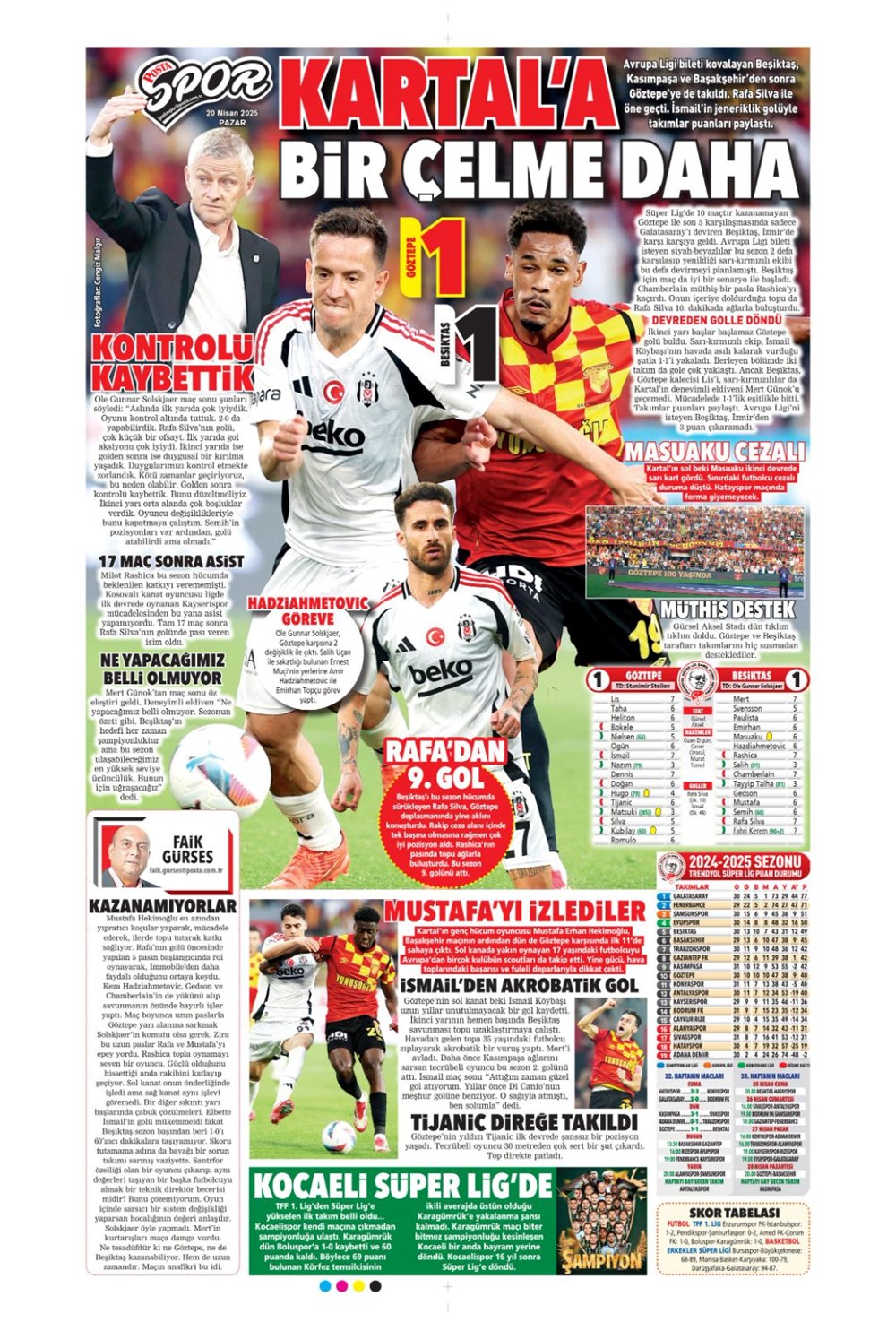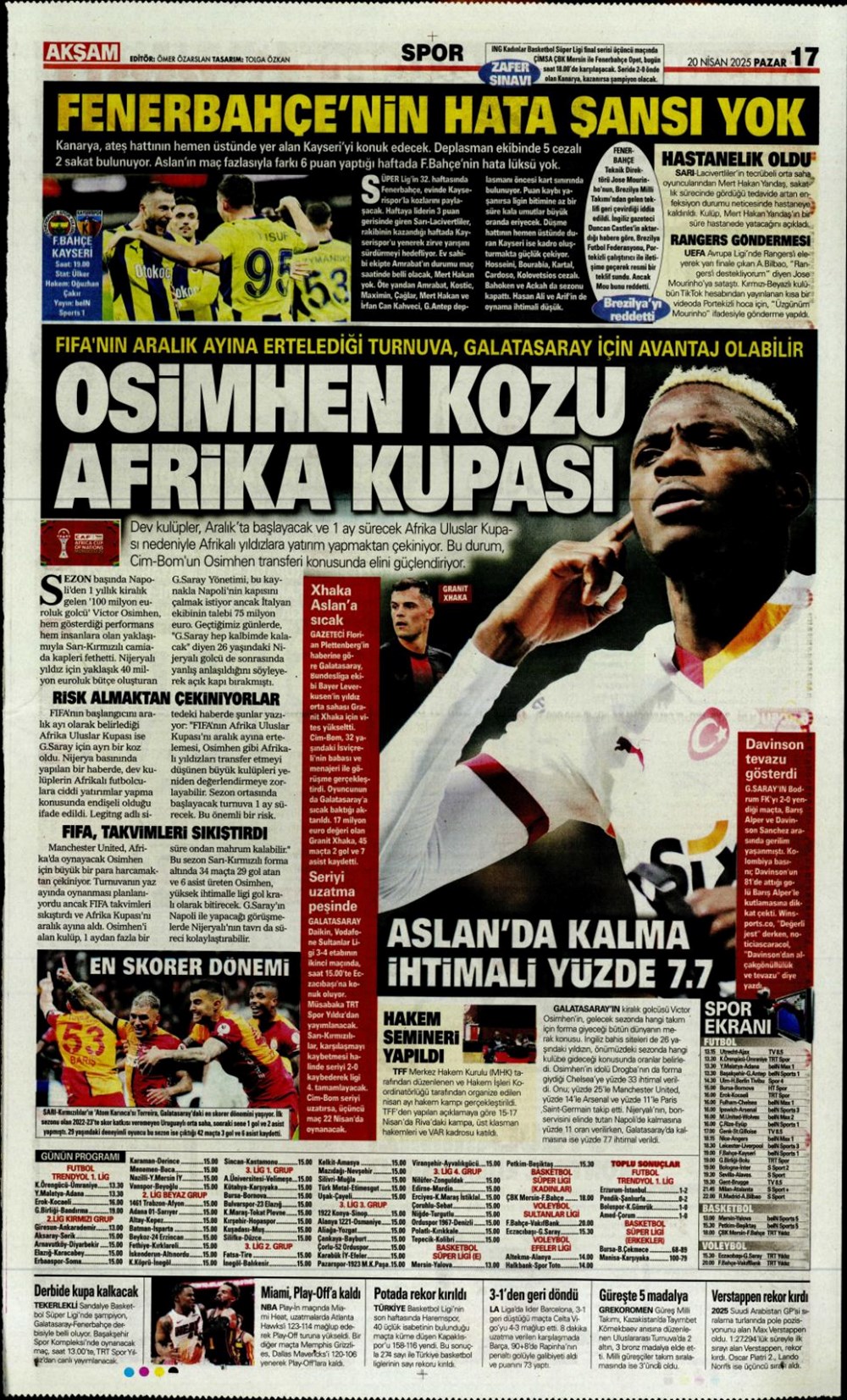 “Kartal’a İzmir’de soğuk duş” (20 Nisan 2025 spor manşetleri)Günün spor manşetlerinde, spor gündemiyle alakalı en yeni gelişmeler ve transfer haberleri belli oldu. 20 Nisan 2025 tarihli gazetelerin spor sayfalarına, Beşiktaş, Fenerbahçe, Galatasaray ve Trabzonspor’un haberlerine, 1 dakikada göz atın.