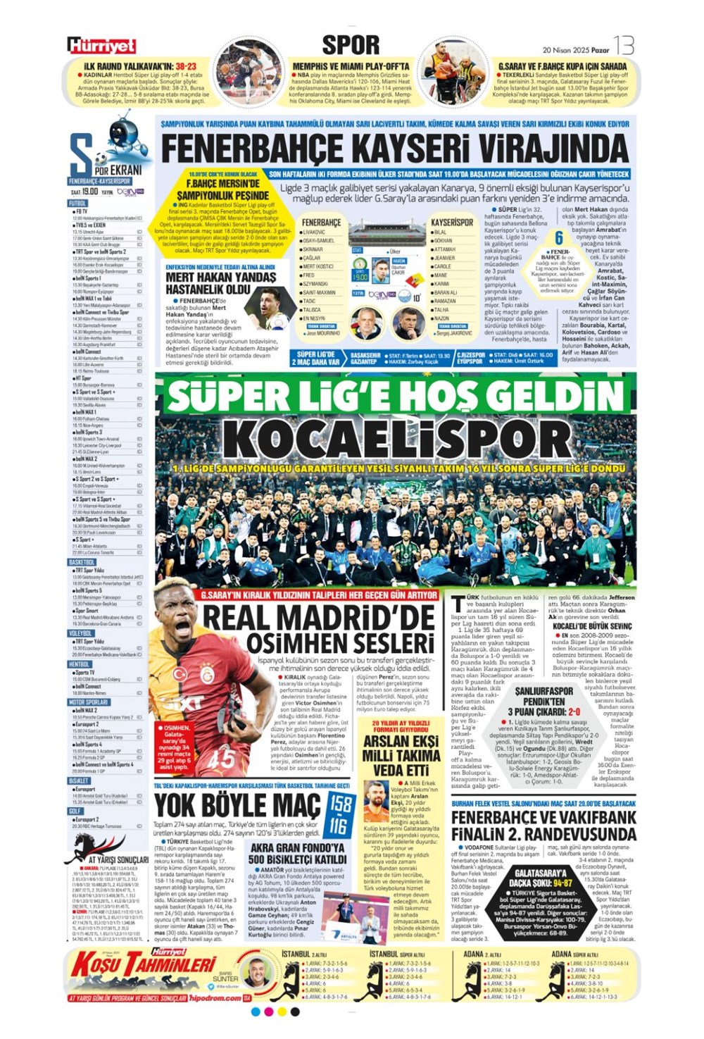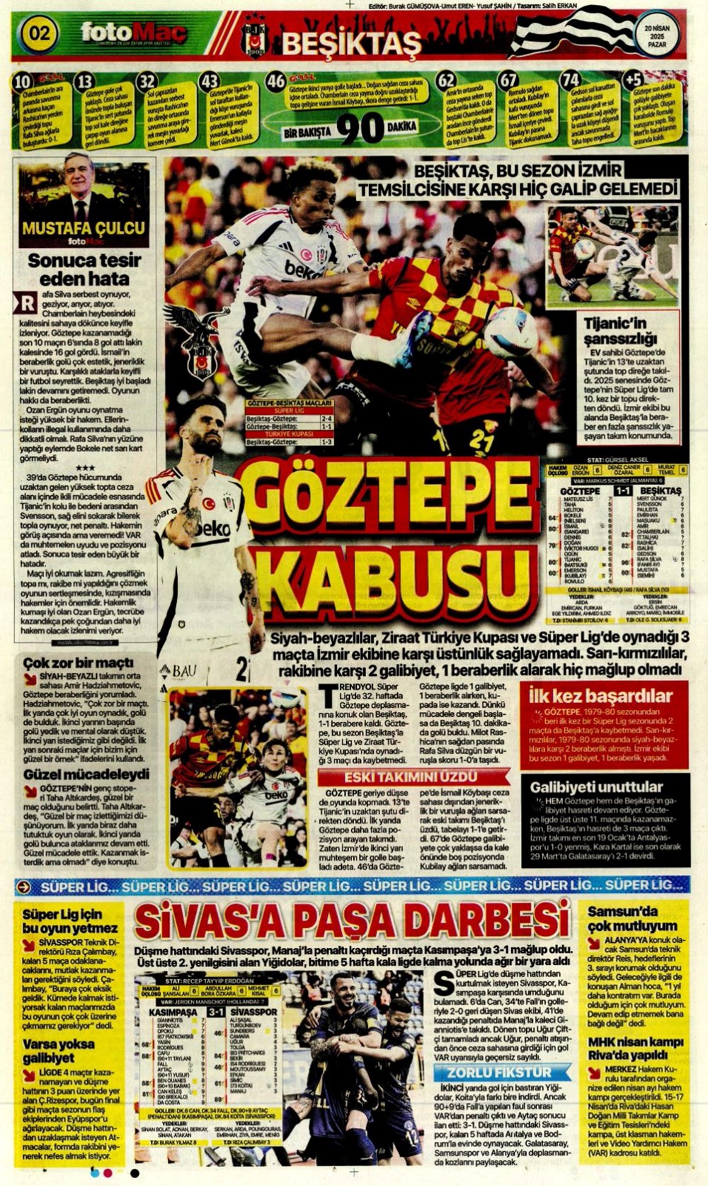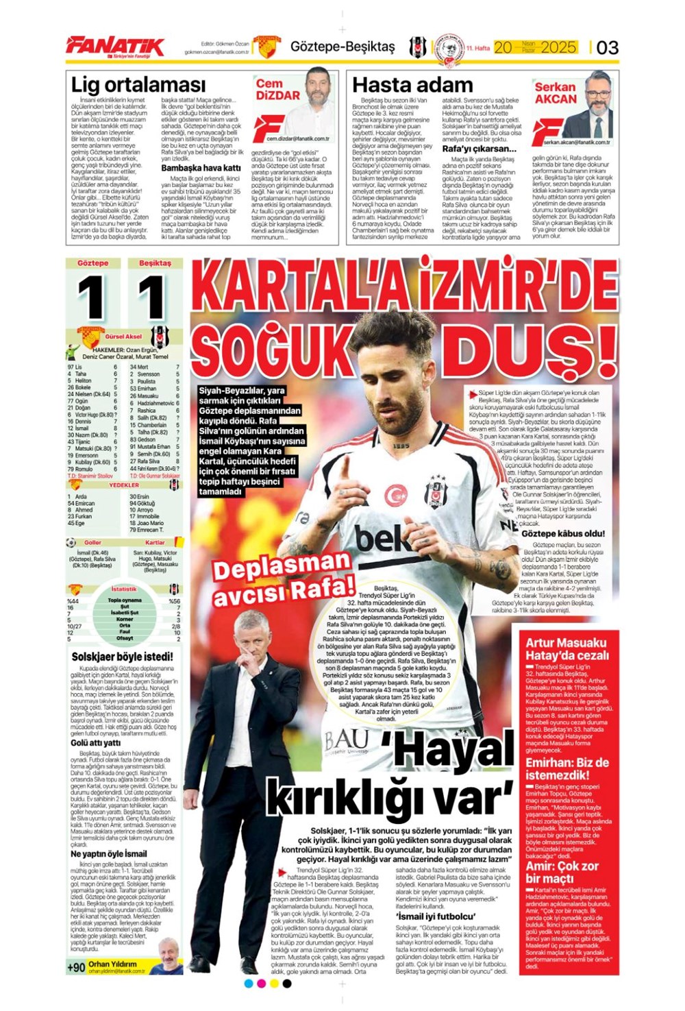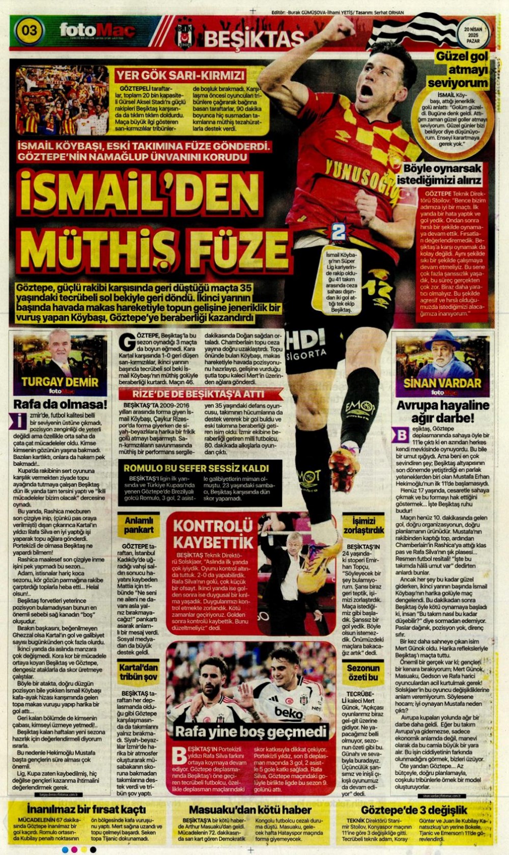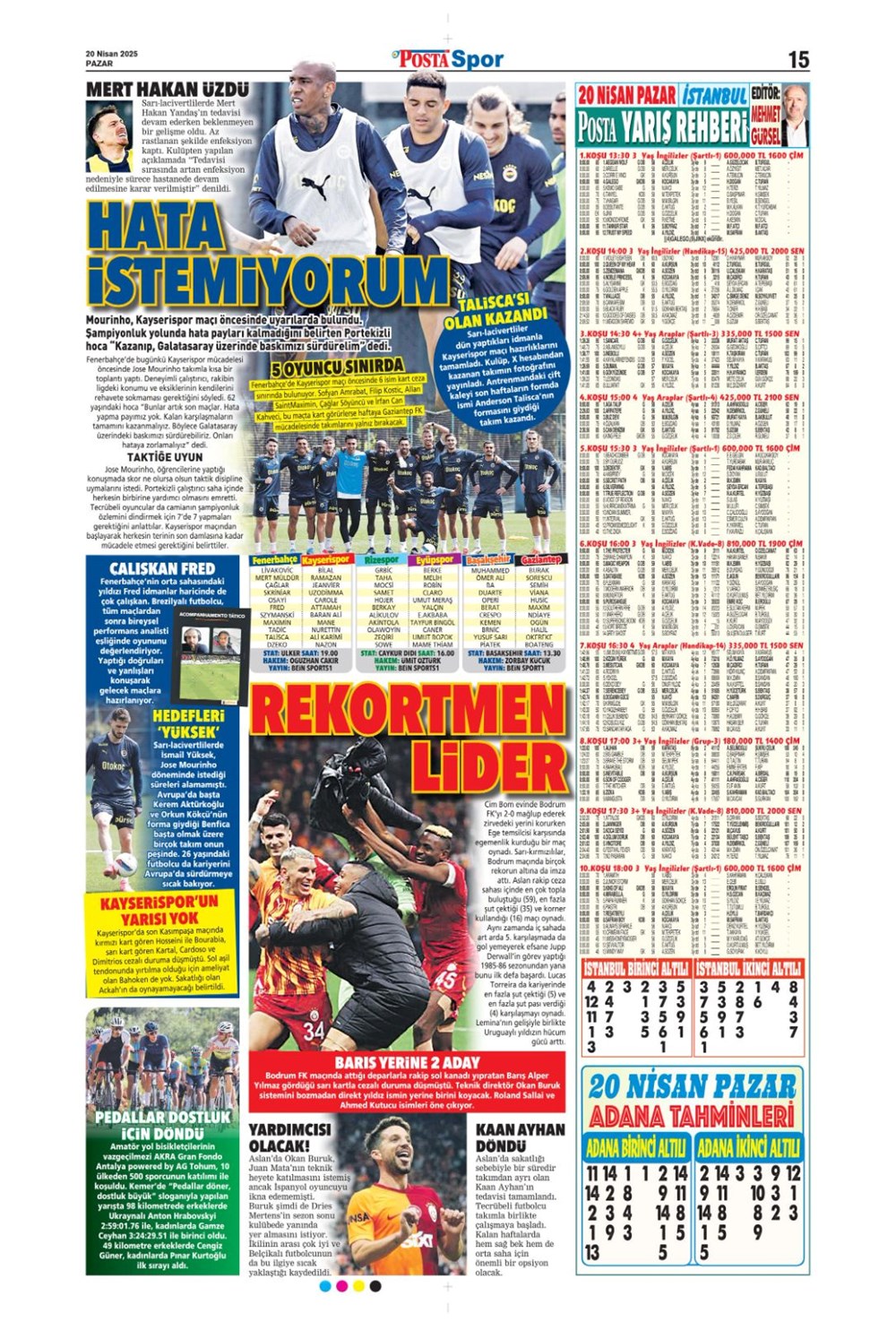 “Kartal’a İzmir’de soğuk duş” (20 Nisan 2025 spor manşetleri)Günün spor manşetlerinde, spor gündemiyle alakalı en yeni gelişmeler ve transfer haberleri belli oldu. 20 Nisan 2025 tarihli gazetelerin spor sayfalarına, Beşiktaş, Fenerbahçe, Galatasaray ve Trabzonspor’un haberlerine, 1 dakikada göz atın.