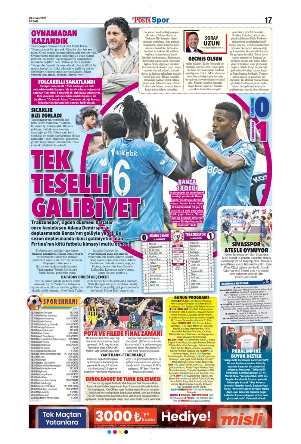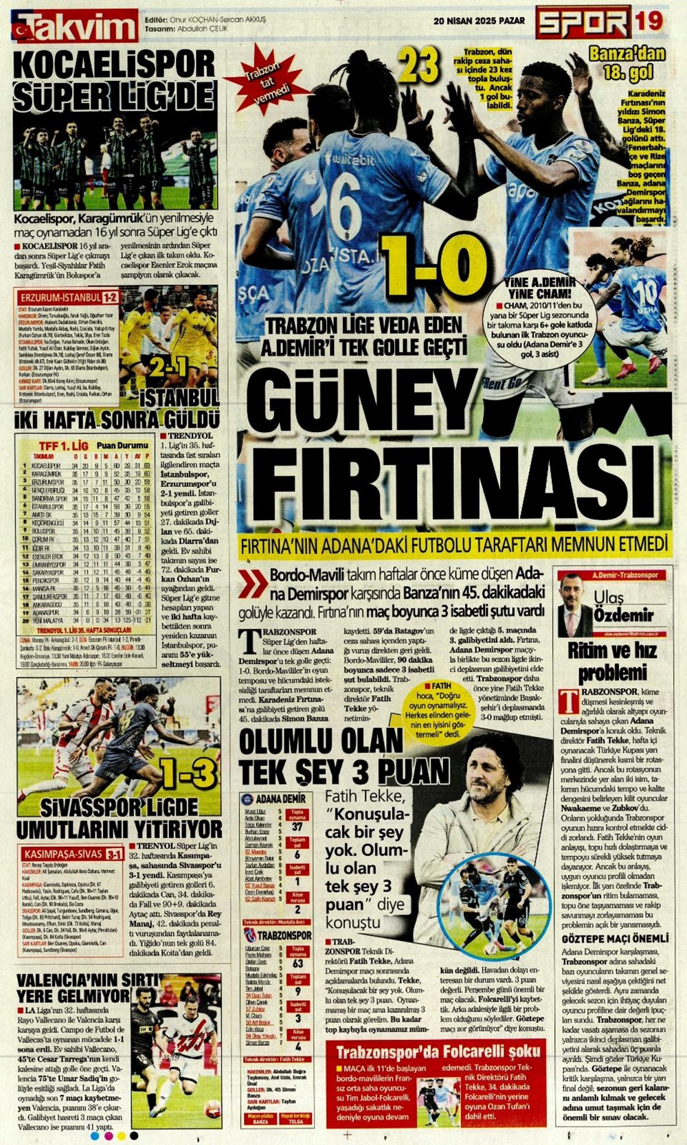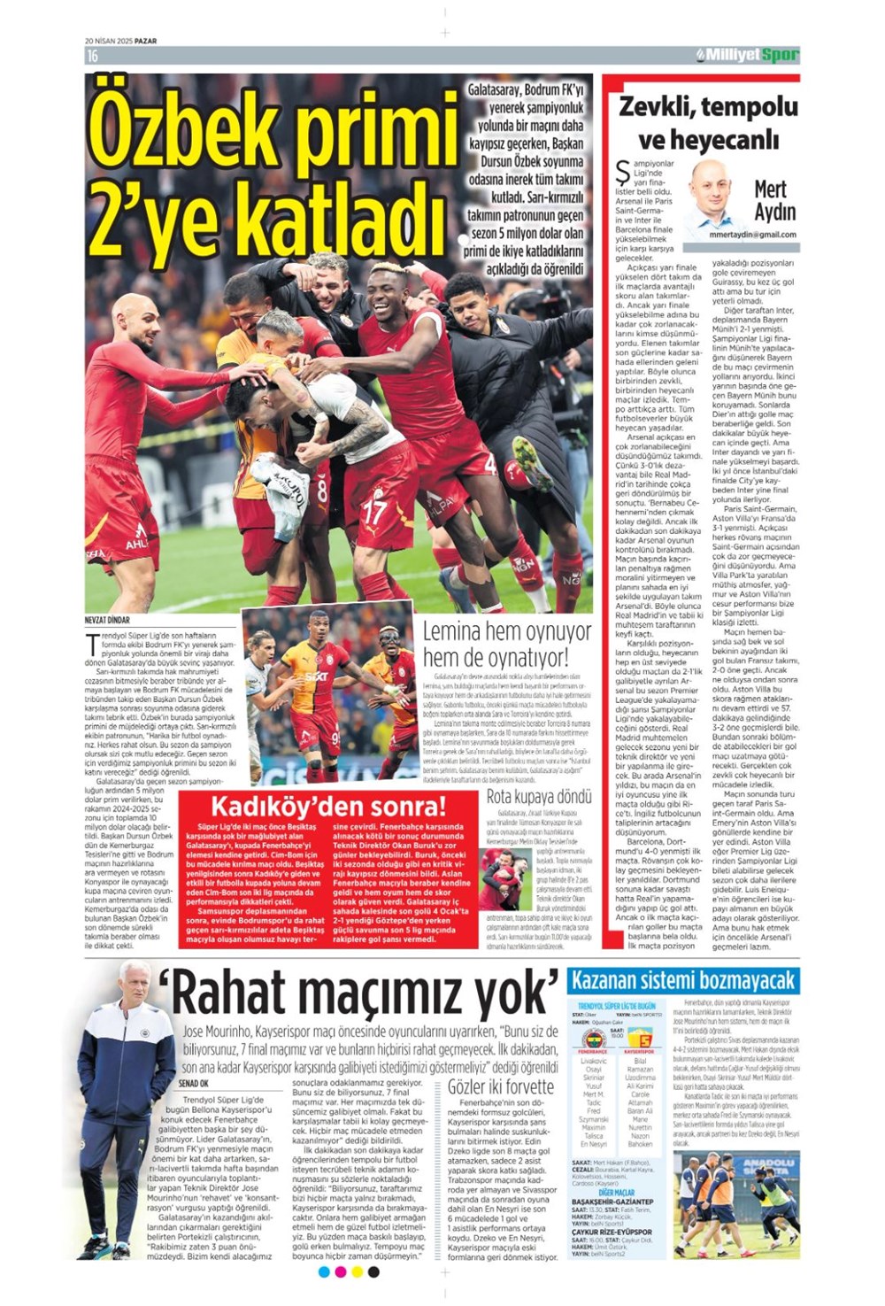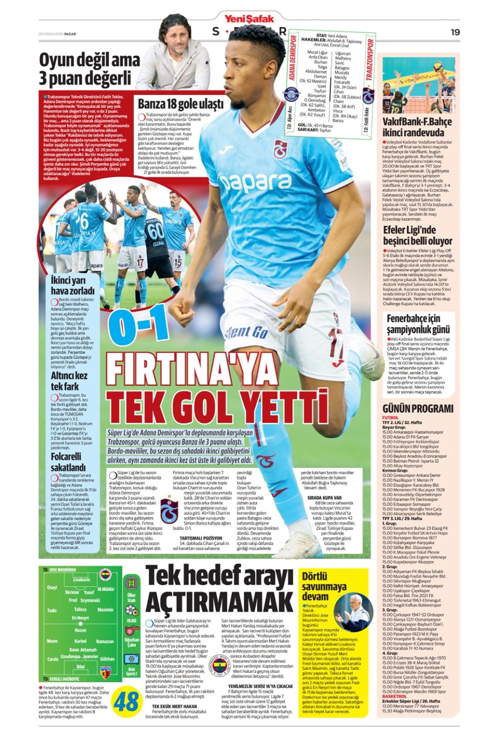 “Kartal’a İzmir’de soğuk duş” (20 Nisan 2025 spor manşetleri)Günün spor manşetlerinde, spor gündemiyle alakalı en yeni gelişmeler ve transfer haberleri belli oldu. 20 Nisan 2025 tarihli gazetelerin spor sayfalarına, Beşiktaş, Fenerbahçe, Galatasaray ve Trabzonspor’un haberlerine, 1 dakikada göz atın.